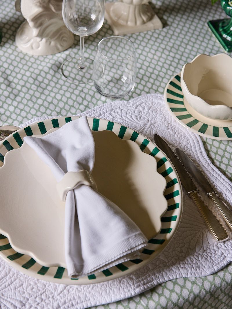 A selection of our ceramic tableware is available in our Scroll design, including dinner plates, charger plates, side plates, salad bowls, pasta bowls, bowls, dipping and peanut bowls, oval platters, teapots, water and milk jugs, mugs, espresso and coffee cups and egg cups each decorated with delicately hand-painted leafy Scroll patterns.