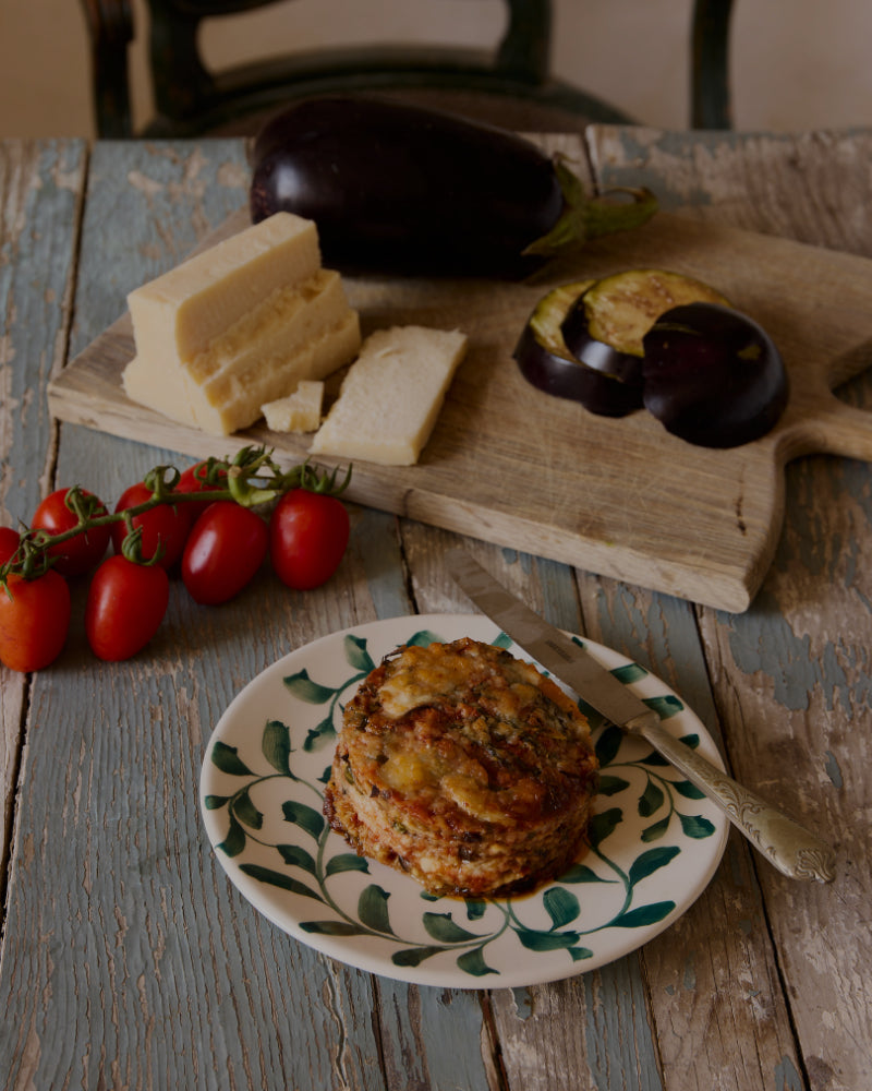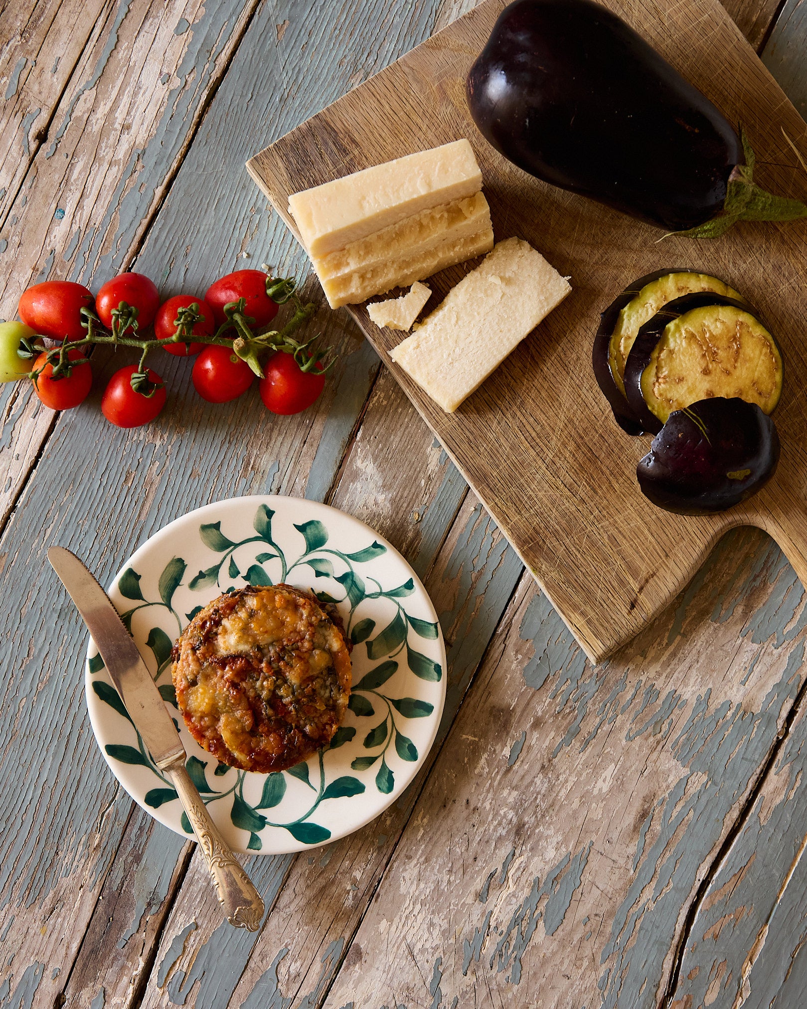 In a small baking dish, layer tomato sauce, aubergine, mozzarella, and Parmesan. Repeat the layers, finishing with Parmesan.